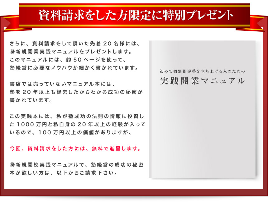 ㊙新規開校実践マニュアルで、塾経営の成功の秘密本が欲しい方は、以下からご請求下さい。