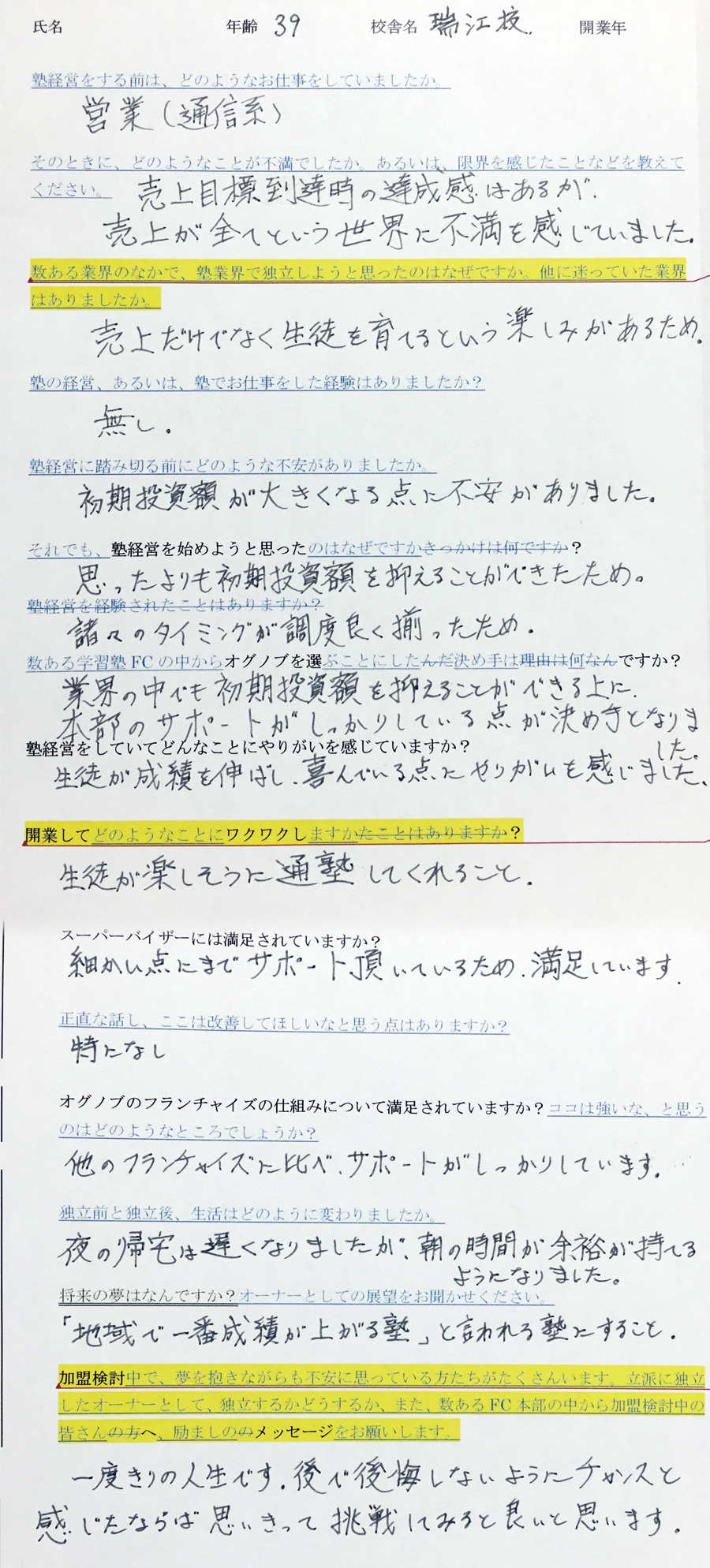 利益率の高さから塾を選び、ノウハウを持つフライチャイズが効率が良いと考えてスタートしました。